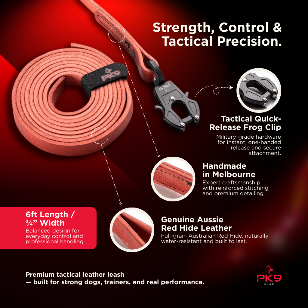 The PK9 Gear Premium 6ft Leather Dog Leash combines luxurious Australian Red Hide Leather, handcrafted excellence, and secure tactical features for a stylish, durable, and reliable leash that’s perfect for any outing or training session.