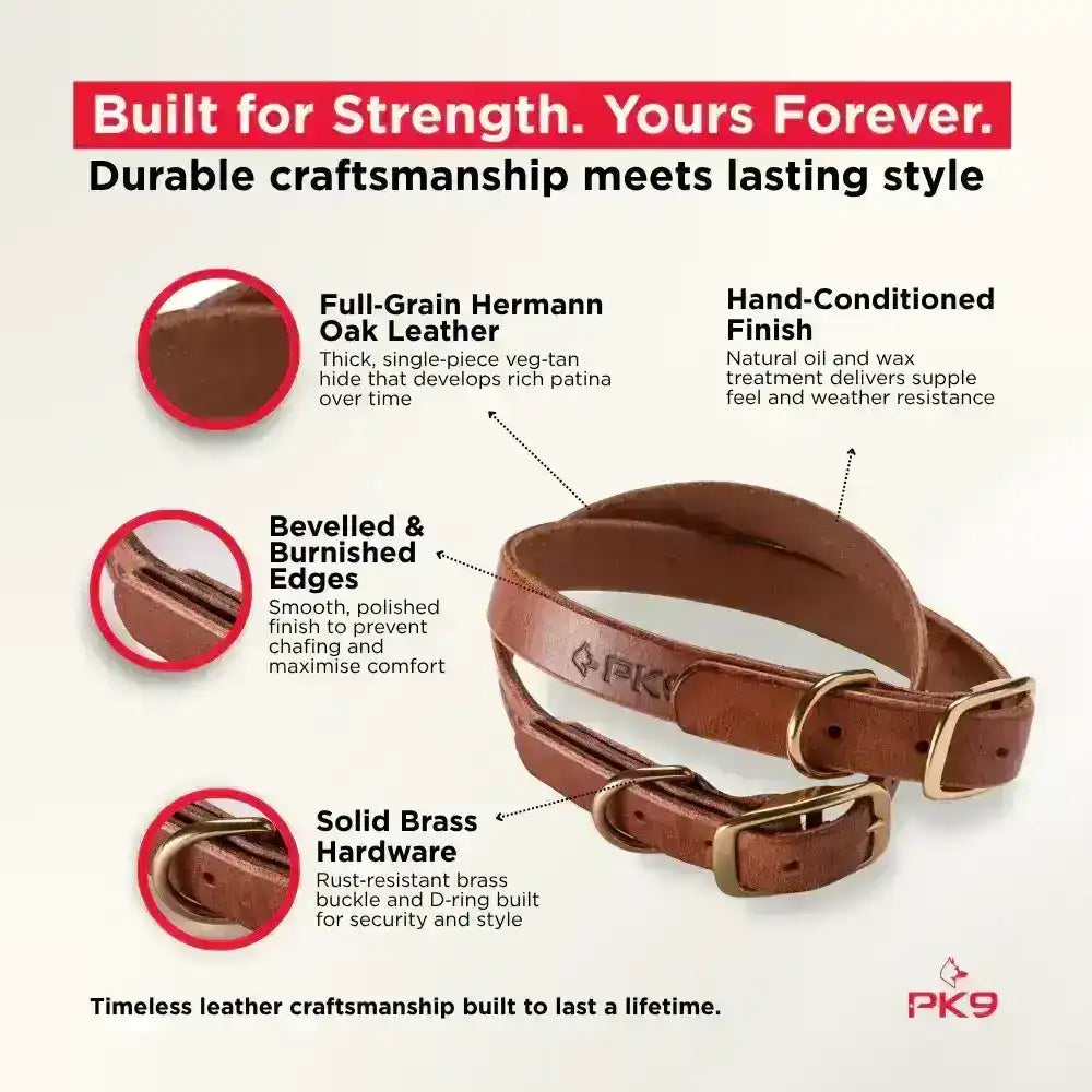Handcrafted in Melbourne from premium Hermann Oak Old World Harness Leather, the PK9 Gear Leather Dog Collar combines strength, comfort, and timeless style. Perfect for active dogs, this collar can be personalised for a unique and lasting touch.