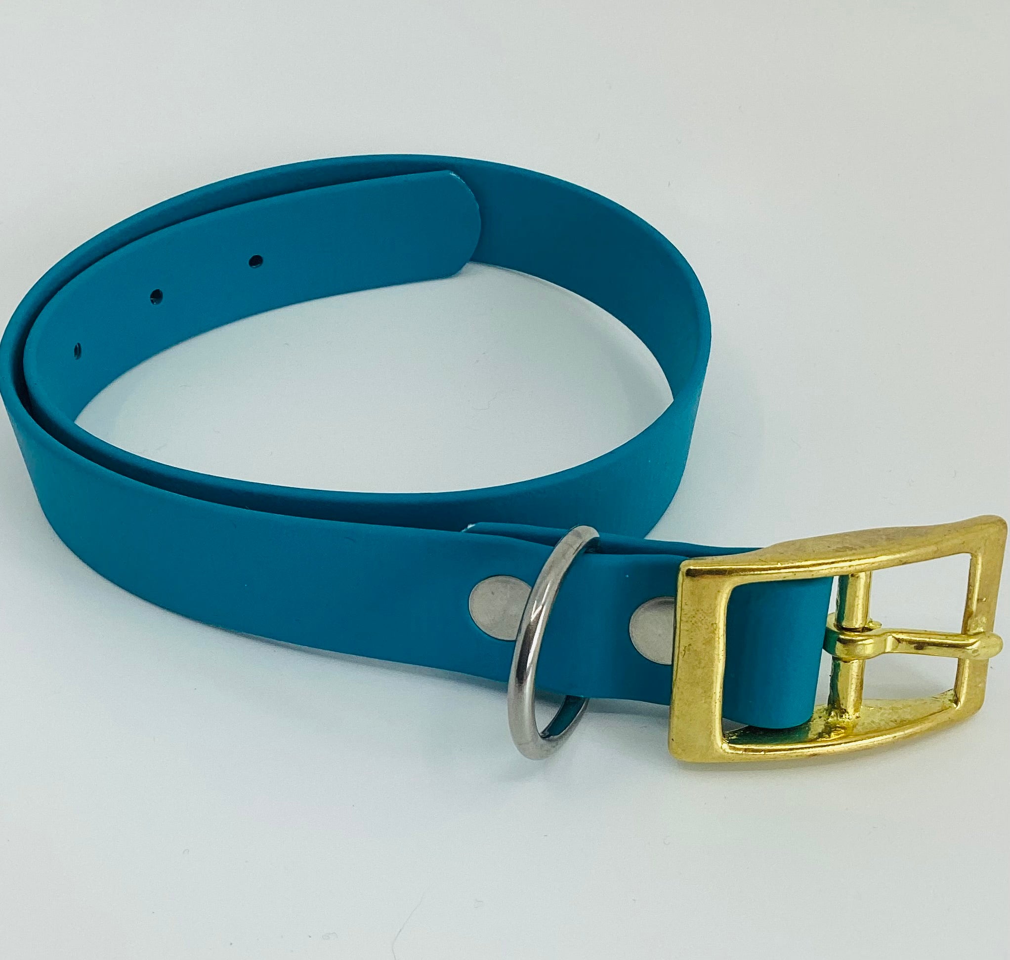 Features: ∙ Waterproof and easy to clean - perfect for all weather conditions ∙ Won’t absorb odors or bacteria like traditional leather ∙ Eye-catching teal color won’t fade or discolor ∙ Brass buckle with stainless steel D-ring and rivets ∙ Adjustable sizing fits larger breeds comfortably ∙ Flexible yet strong biothane won’t crack or split ∙ Stainless steel rivets provide secure, long-lasting construction