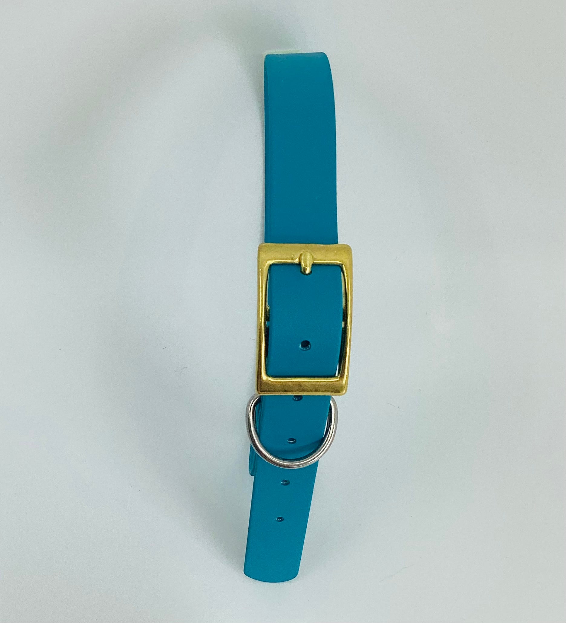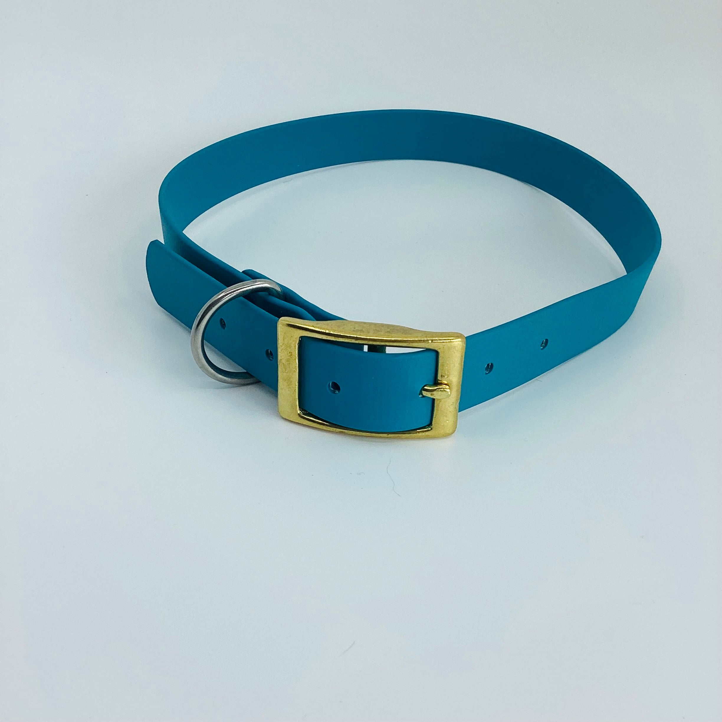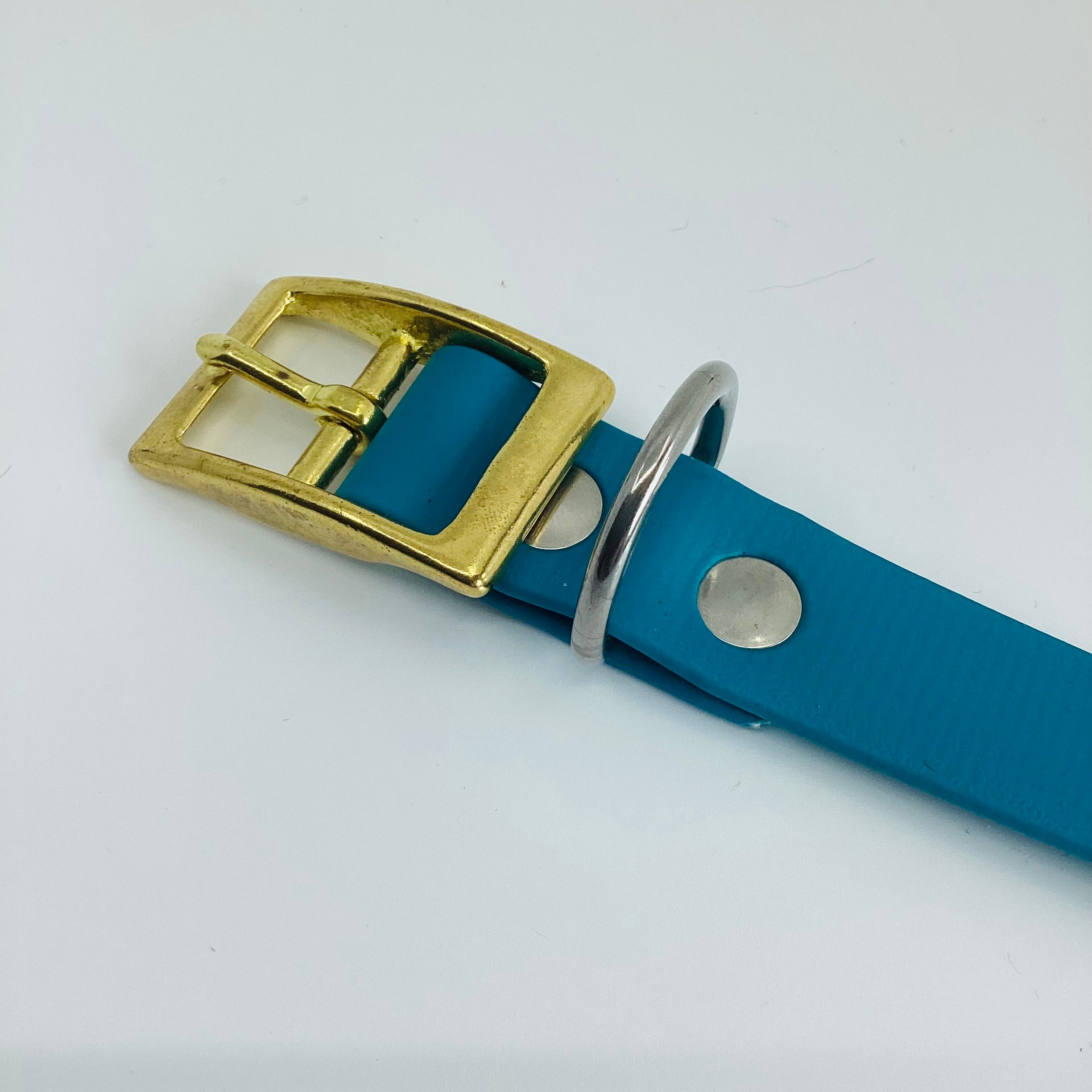 Vibrant teal biothane collar featuring brass buckle and stainless steel hardware for durability and style.