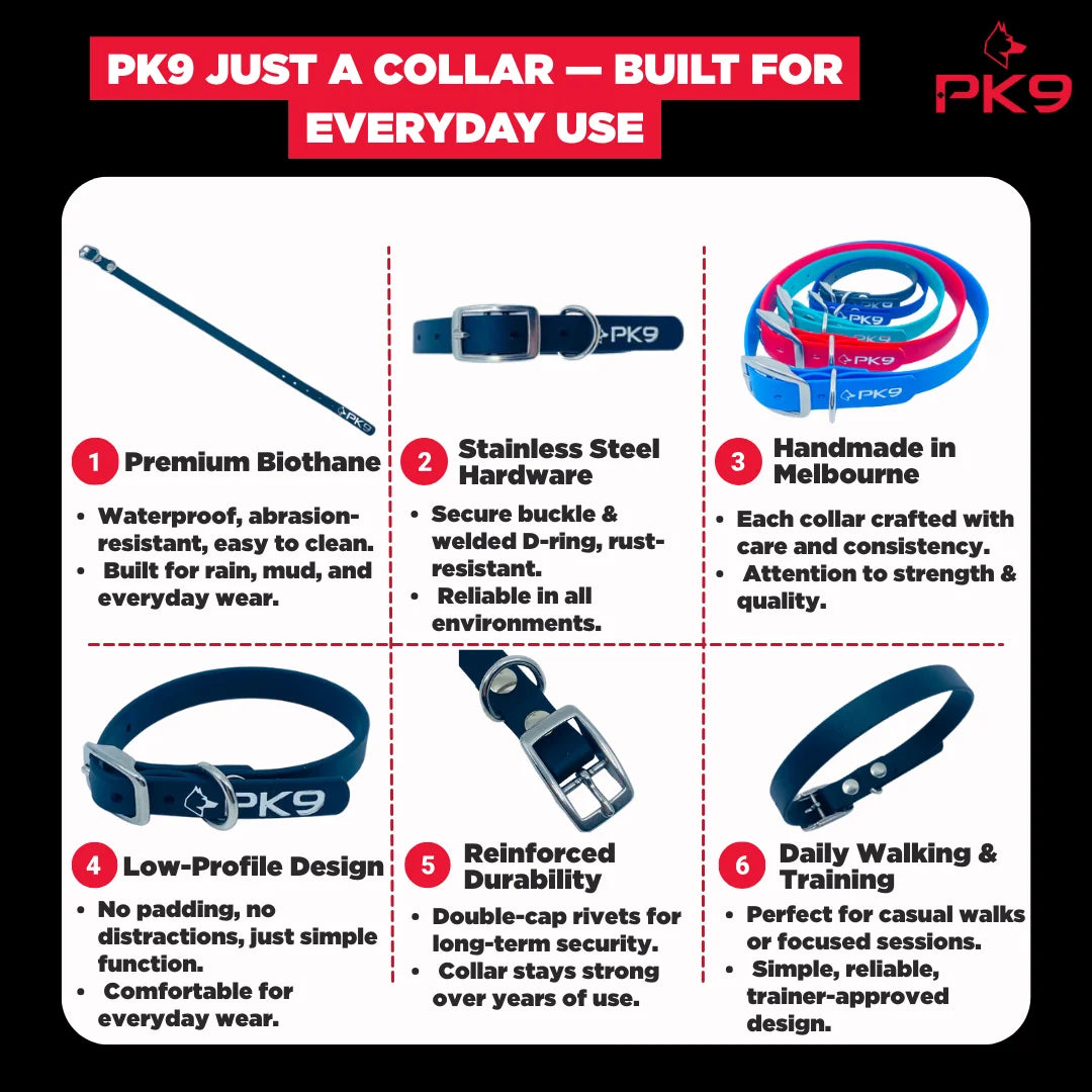 Built for reliability, simplicity, and everyday durability, the PK9 Just a Collar is handmade in Melbourne using premium Biothane and solid stainless steel hardware. Designed for trainers, handlers, and dog owners who want a collar that simply works — day in, day out.