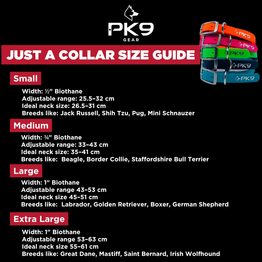 Finding the right collar size is essential for your dog’s comfort and safety. The PK9 Just a Collar comes in Small, Medium, Large, and Extra Large, with adjustable ranges to suit a wide variety of breeds. Each size is designed to sit comfortably on your dog’s neck without slipping or causing pressure. Using the infographic, you can quickly compare widths, neck measurements, and ideal breeds to ensure the perfect fit. A well-fitted collar allows for better control during walks and training, making every session safer and more enjoyable. Measuring your dog before ordering ensures a collar that works reliably day in and day out.