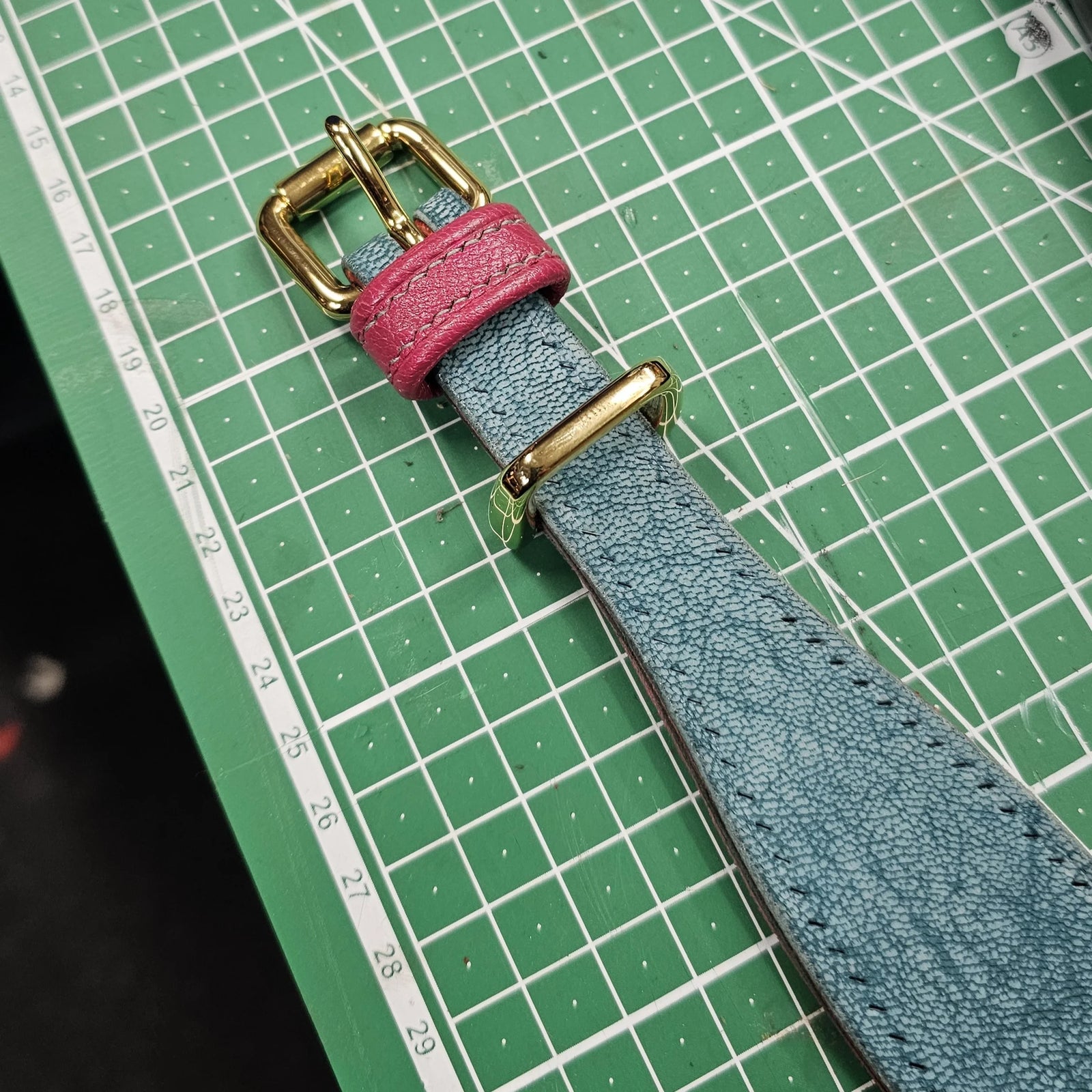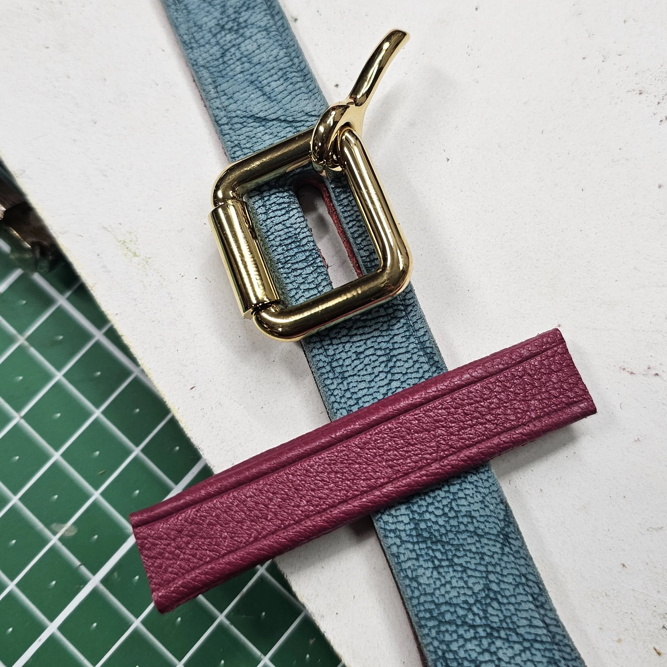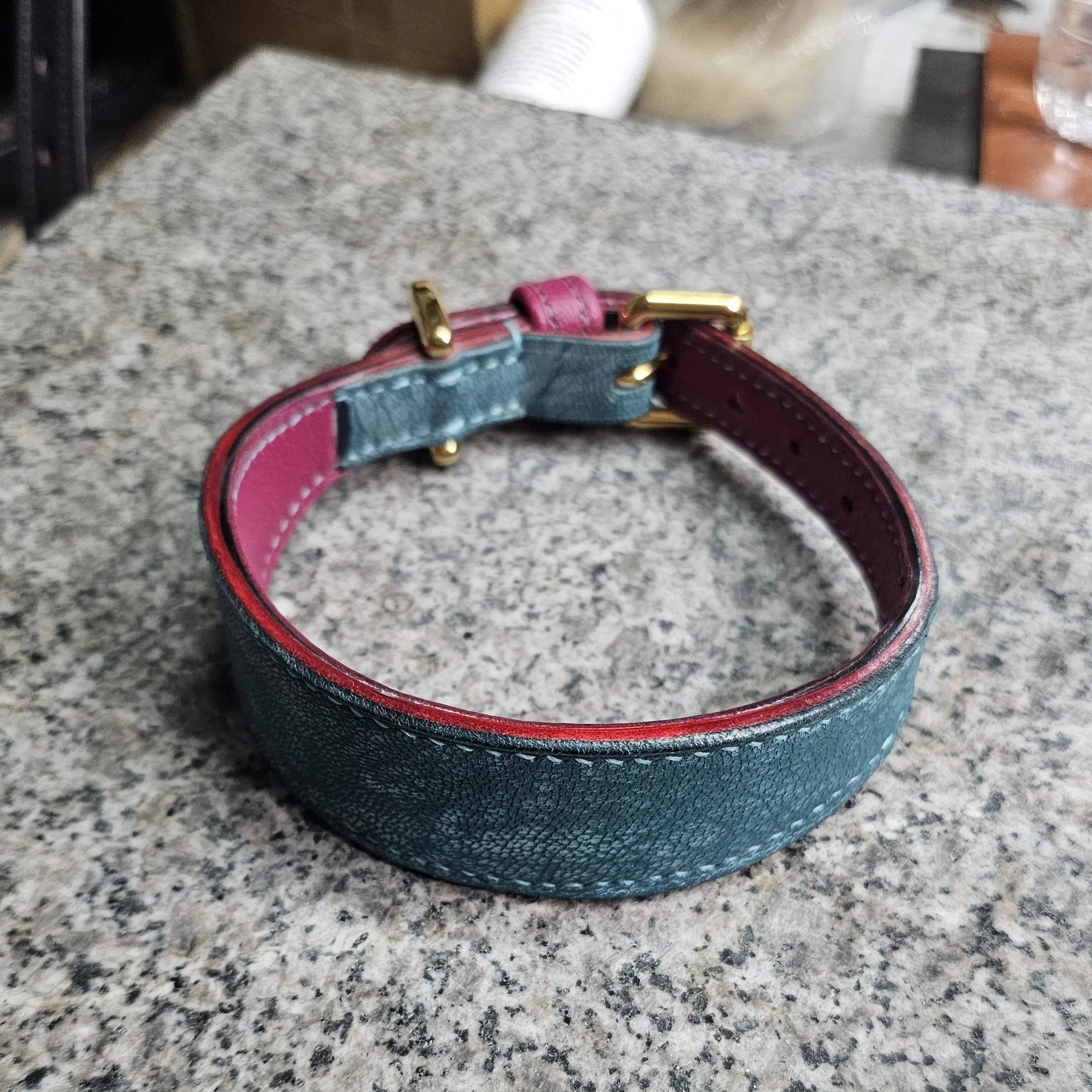 French Alran Chèvre “Fatnat” goat leather in a vibrant turquoise, renowned for its distinct grain and luxurious feel. Sourced from the prestigious Alran tannery in France, this leather is celebrated for its balance of softness, durability, and visual depth, bringing a refined, high-end finish to the collar