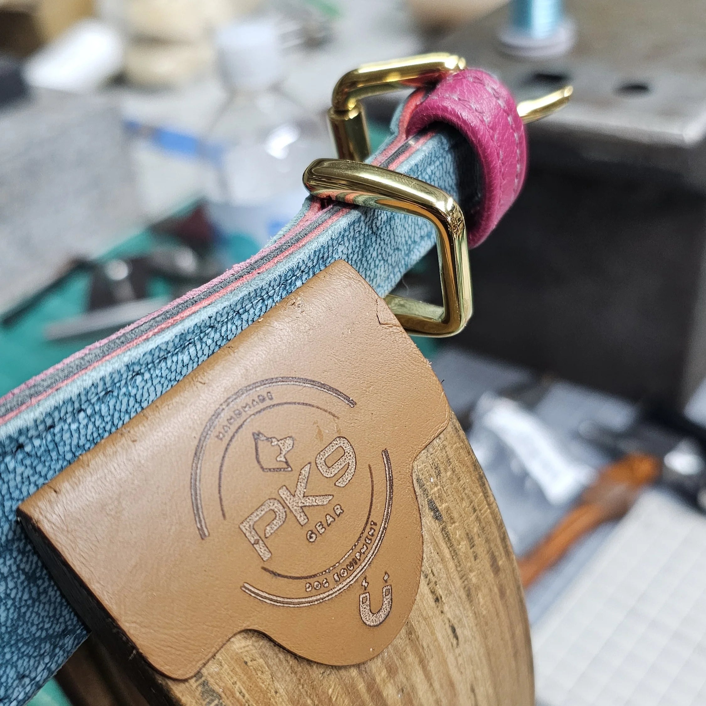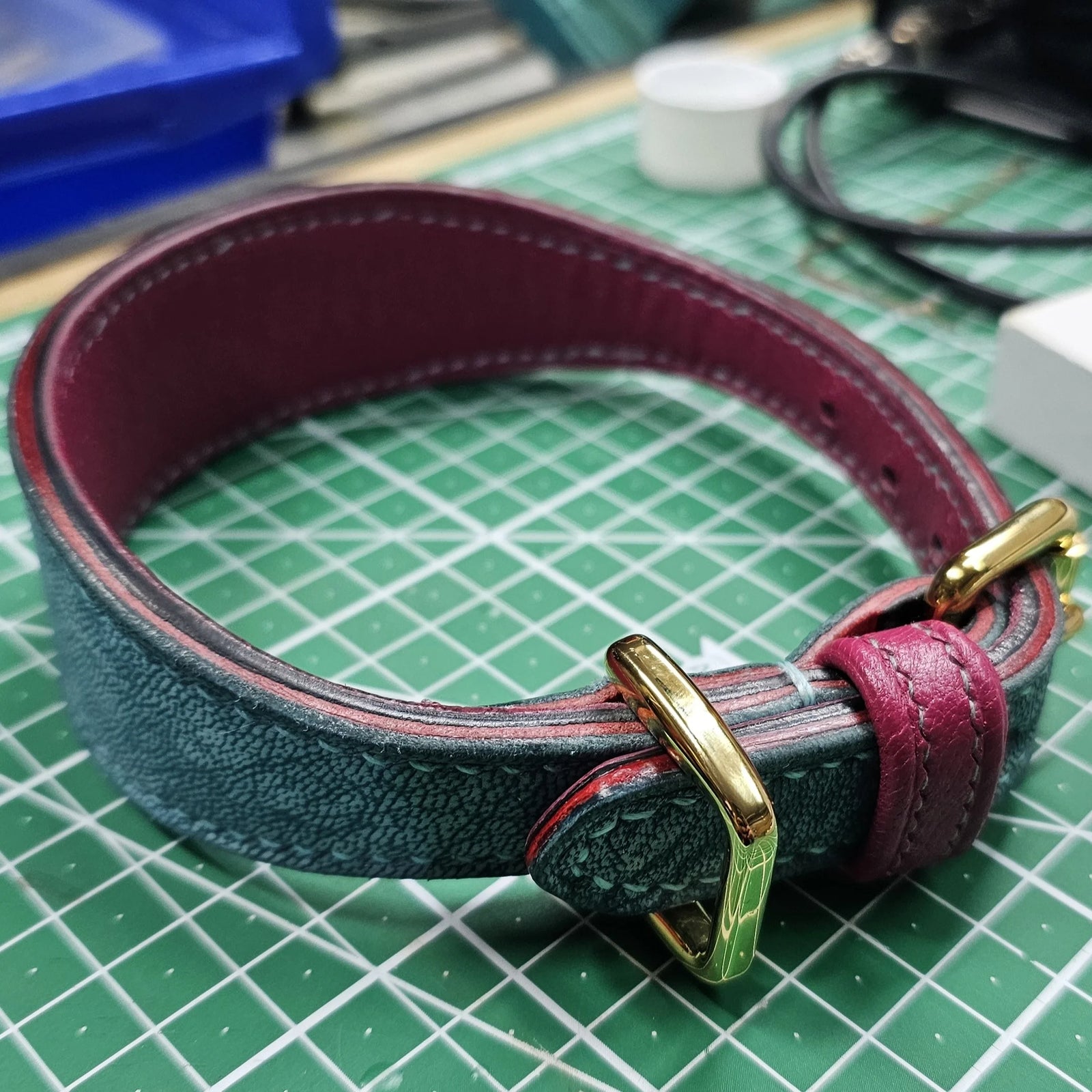 French Alran Chèvre “Sully” goat leather in rich purple, providing a soft, comfortable lining against the dog’s neck. This leather is chosen for its smooth texture and resilience, enhancing comfort during extended wear while adding a subtle layer of luxury and contrast to the design.